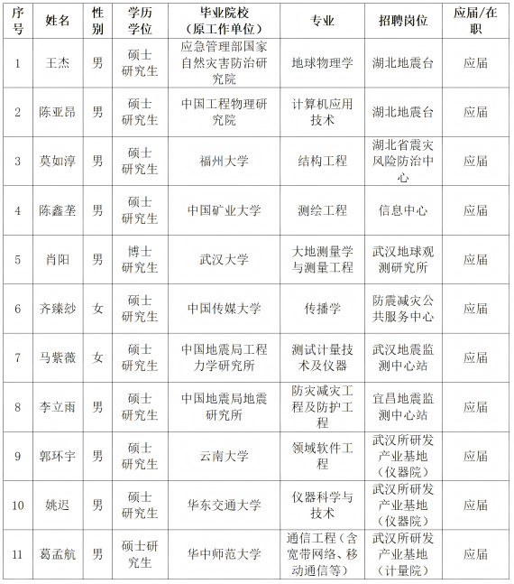 依据《事业单位公开招聘人员暂行规定》(中华人民共和国人事部令第6号)和中国地震局2025年度事业单位公开招聘相关要求,按照《湖北省地震局2025年度公开招聘事业单位工作人员公告》,本着公开、平等、竞争、择优的原则,经过报名、资格审查、笔试、面试、体检、考察等程序,并经湖北省地震局党组会研究决定,拟招聘王杰等11人为湖北省地震局事业单位工作人员,现予以公示。